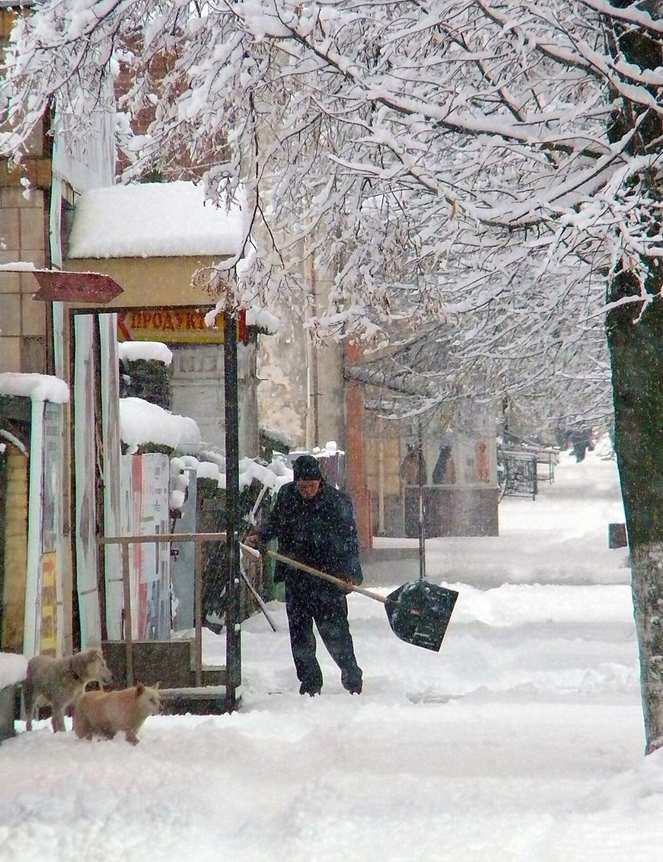 Добрый дворник, наверное собаки его. А сзади наверное ветеринарная клиника?