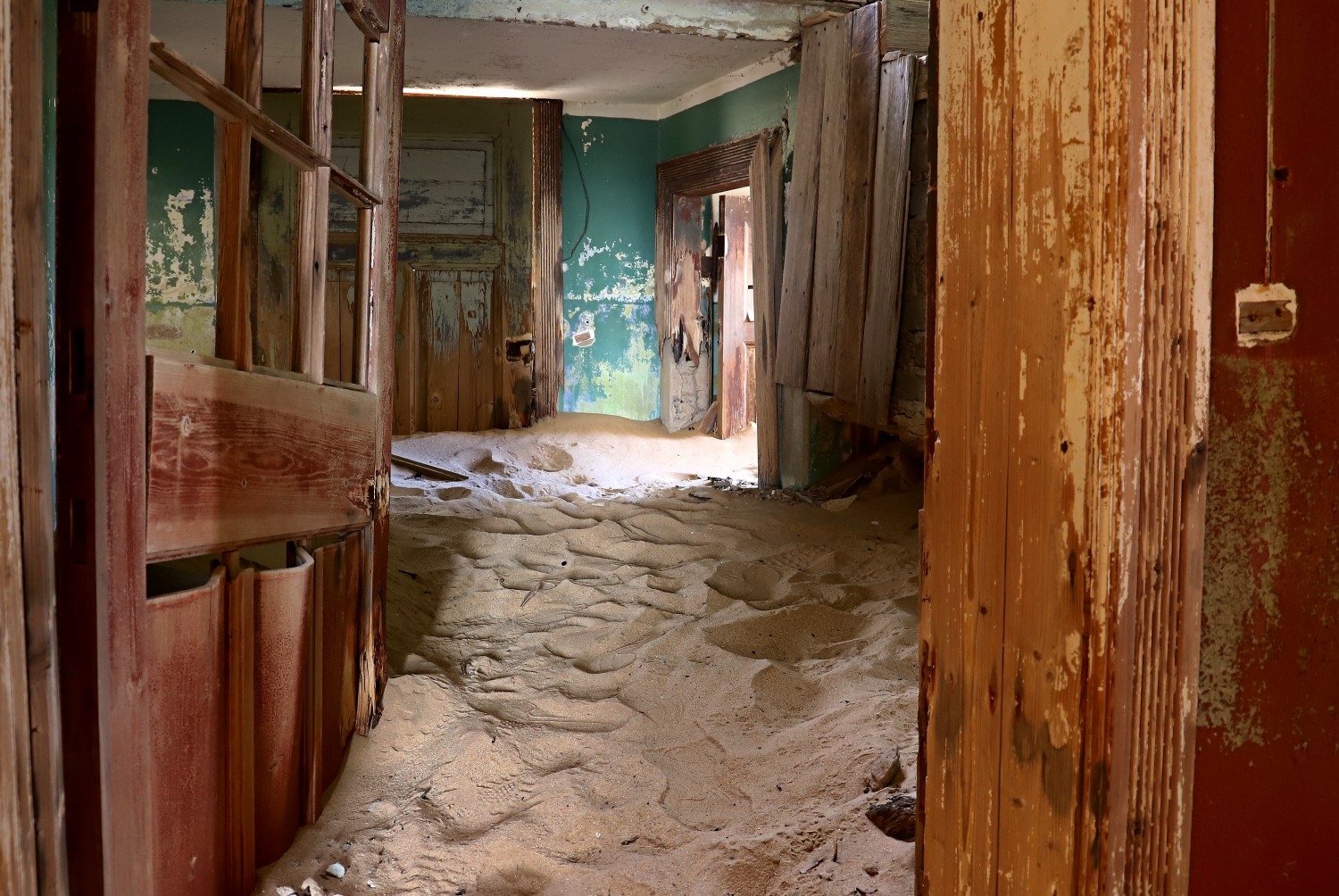 Вот я не знаю, что на полу. Может быть, снег. Но фотография крутая. Сейчас не могу найти имя фотографа, который снимал заброшенные здания в пустыне с песком:( Удачи, Капитан