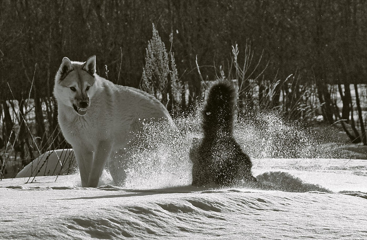 А мне кажется как раз таки котейка нападает, а пёс защищается) Понравилось как снежные брызги добавили к напряжённому моменту)