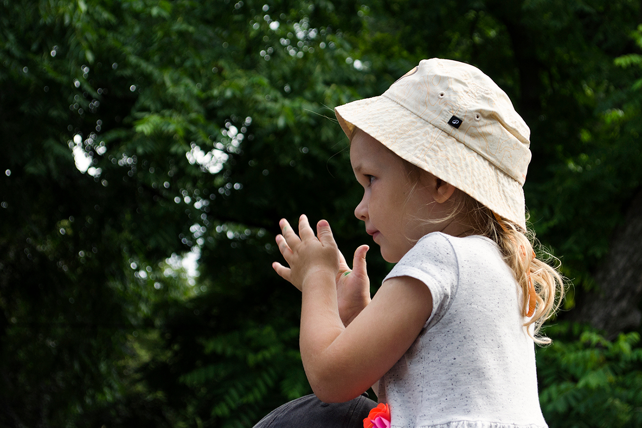 Девочка следит за представлением, сидя на плечах у папы.