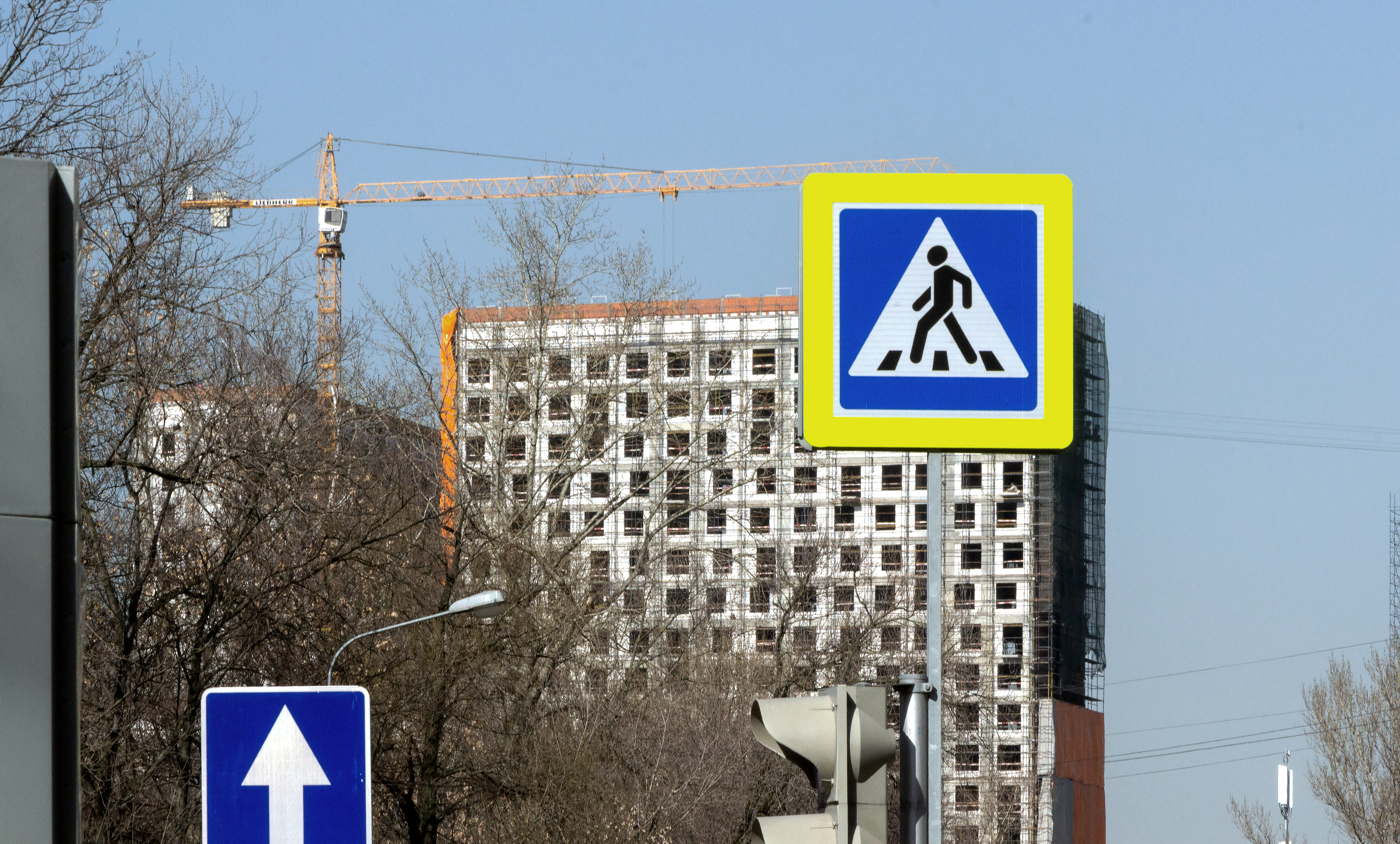 Взгляд по "стрелке" уходит по вертикальным структурам крана до пересечения с его стрелой, потом по стреле движется вправо до знака "Пешеходный переход", по его столбику спускается до светофора, а "глаза" светофора в завершении всего "смотрят" (и уводят взгляд зрителя) снова на стрелку". И так взгляд обегает фотографию по кругу. Может даже и не раз.
