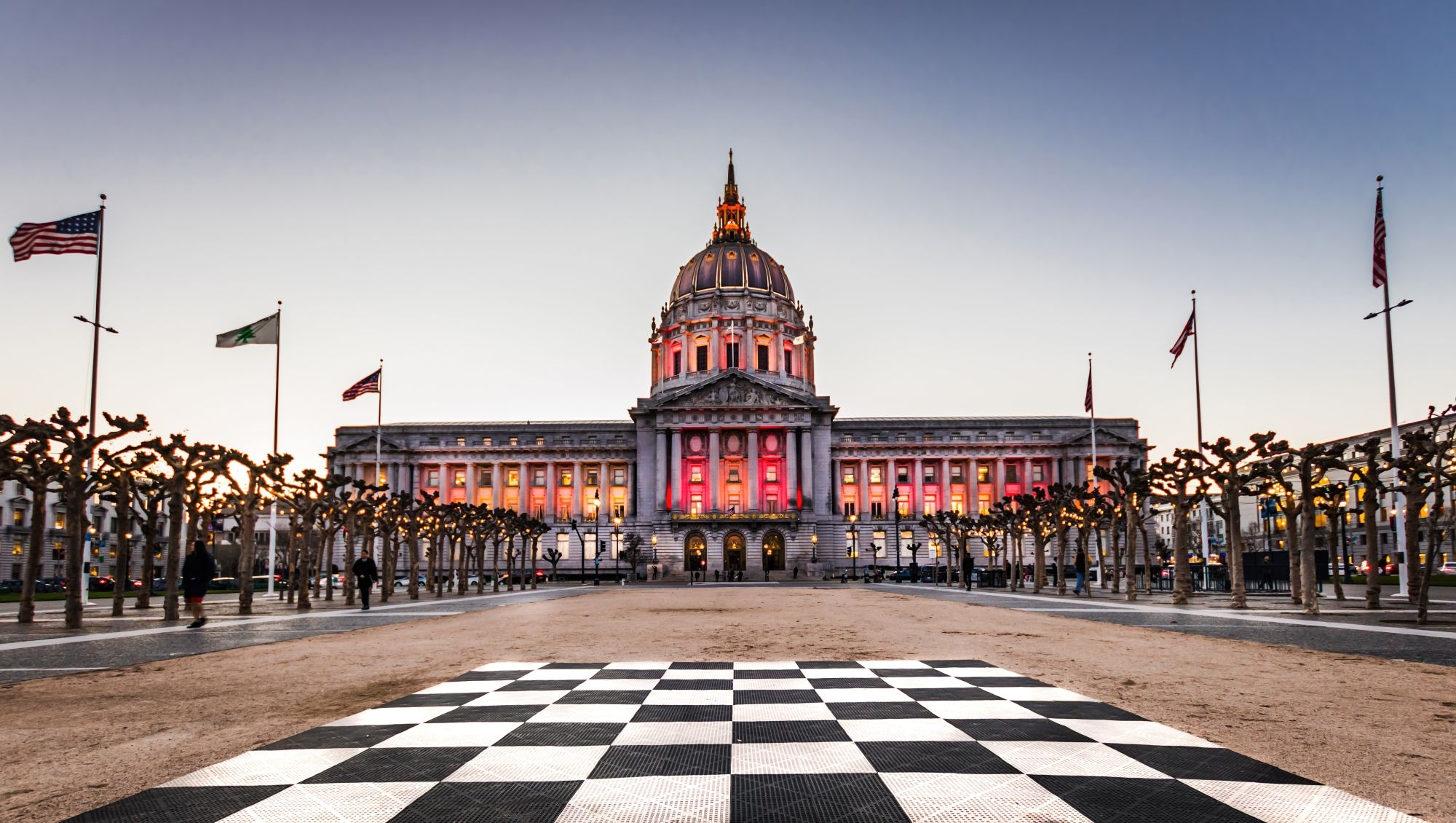 1) Не удалось найти информацию о существовании перед ратушей в Сан-Франциско черно-белого шахматного поля.)