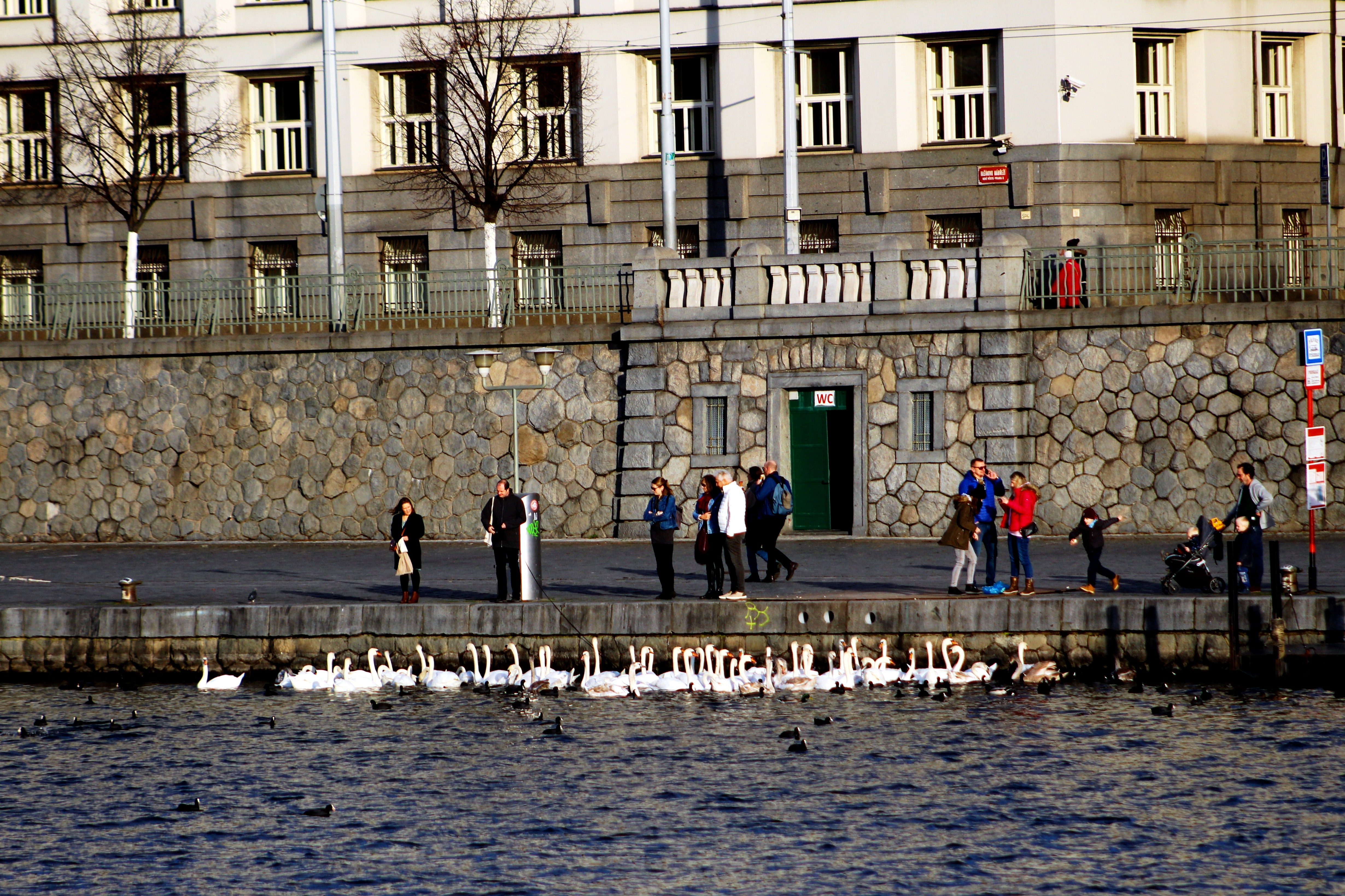 Прага, 31 декабря 2021 года, прохожие кормят птиц.