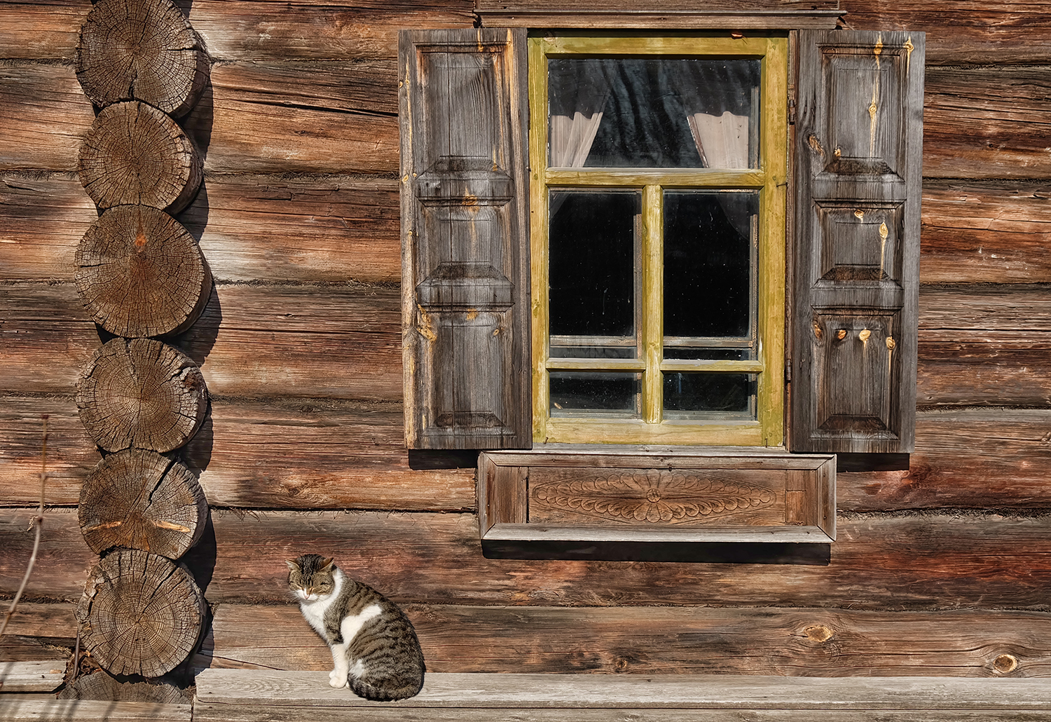 На эту завалинку посадить деда с балалайкой и в лаптях и бабку в цветастой шали, а кошку на подоконник рядом с цветочным горшком и веснушчатой девчонкой))