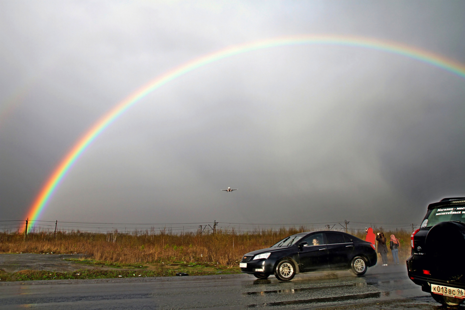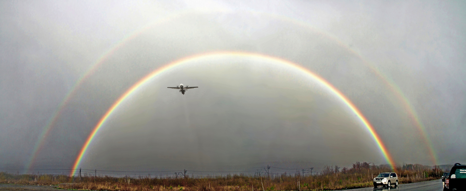 Доброго времени суток, Ян! Если не пропал у вас интерес, хочу пояснить: Снято это возле взлетно-посадочной полосы аэропорта Кольцово (Екатеринбург). Довольно много стояло автомобилей, пассажиры которых просто любовались самолетами заходящими на посадку прямо над нашими головами. Прошла сильная гроза, появилась радуга и самолеты заходили на посадку какбы из под нее. К сожалению фото в RAW не сохранились, но, предъявляю еще несколько фото снятых под той же радугой, с этим и еще с другим самолетом! ))